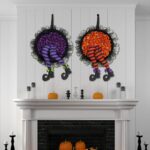 【Unique Design】Halloween wreath with intricate lace, purple + orange striped witch legs with spiders, and glitter boots, they give your home a vintage rustic feel. The witch’s leg is filled with enough cotton to be soft and fluffy to the touch. It gives your front door a scary Halloween vibe! Use it as a party decoration to welcome trick-or-treaters!