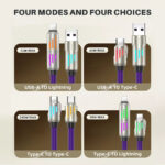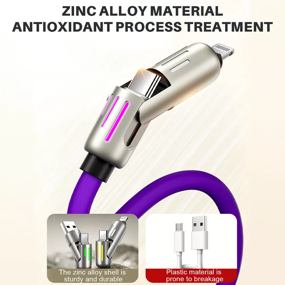 This innovative cable features a 4-in-1 design with USB-A, Lightning, and dual USB-C connectors, offering unparalleled versatility for charging and data transfer. With fast-charging technology, it can handle high power output to charge your devices in record time. Built from premium silicone, the cable is flexible, durable, and resistant to wear and tear. Compatible with a wide range of devices like the iPhone 15 series, MacBook, iPad, and more, it’s the only cable you’ll need for your modern devices.