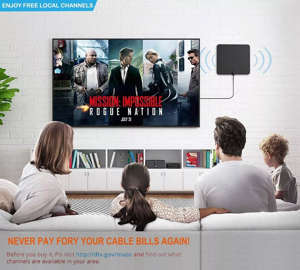 To use the antenna, simply connect it to your HDTV using the included coaxial cable and signal amplifier. Set your TV to the “Antenna” mode and run a quick channel scan using your remote control. Position the antenna on a wall, window, or flat surface for the best reception, and you’re ready to enjoy your favorite shows in stunning HD.