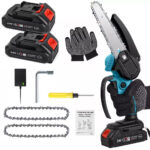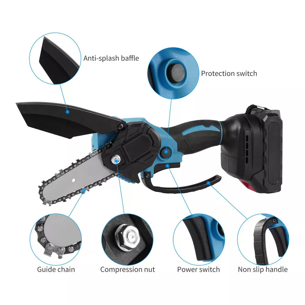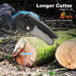 This versatile chainsaw comes with a 4″ or 6″ blade, providing a powerful yet compact solution for cutting through branches, firewood, and dense bushes. The included upgraded 21V battery ensures long-lasting power and quick recharge times. With the ability to cut through a 6-inch branch in just 10 seconds, it’s 10x faster than traditional saws and much lighter than gas-powered models. Plus, it features a side baffle to keep wood chips at bay while maintaining a smooth cutting experience.
