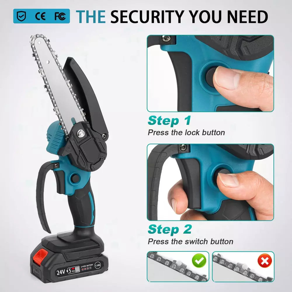 Simply install the battery, and the iToolMax Cordless Chainsaw is ready to go. Grip the handle firmly with one hand, positioning the blade where you want to cut. Press the activation button to start the saw, and make smooth, controlled cuts through branches, bushes, or small trees. After use, allow the chainsaw to cool down and store it in a dry, safe location.