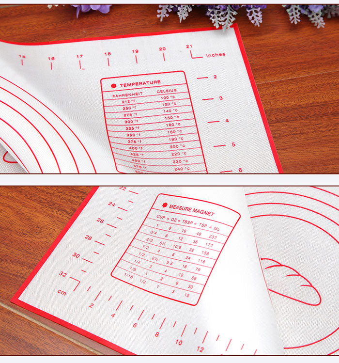 60x40CM Non-Slip Silicone Pastry Fondant Cake Kneading Mat With Measurements. The mat with adopted the high quality glass fiber cloth with high temperature, low temperature resistance, strong adsorption ability, no cracking, soft feeling, good elasticity and no deformation.  Printed sizing guide lets you make perfectly proportioned cookies and pie crusts. You can use the dough mat for more than 2000 times of baking repetition because the design of glass fiber reinforced inside the silicone cushion makes the kneading mat have a long service life.