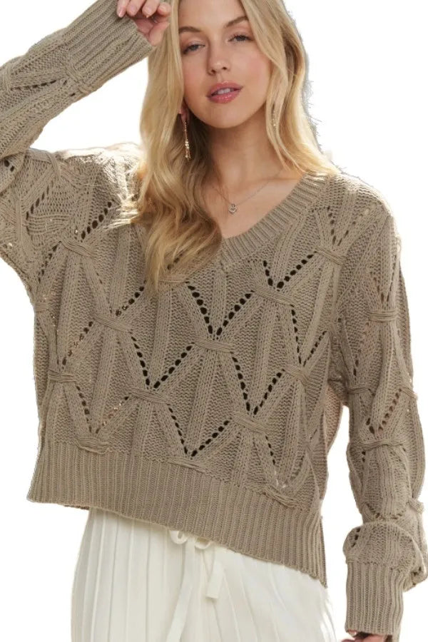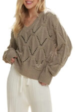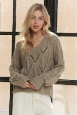 A loose fit V-neck knit top is a comfortable and versatile wardrobe staple. This type of top typically features a relaxed and flowy silhouette, making it a great option for casual everyday wear. The V-neckline adds a flattering touch by elongating the neckline. The knit fabric provides warmth and coziness, making it ideal for cooler weather. You can pair this top with jeans, leggings, or even a skirt for a laid-back yet stylish look. Layer it with a cardigan or jacket for extra warmth or wear it on its own for a simple and effortless outfit.