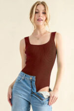 A ribbed square neck bodysuit features a square neckline and a ribbed texture. This form-fitting garment hugs the body and creates a sleek silhouette, making it a versatile piece for layering or wearing on its own. The square neck adds a modern and on-trend touch to the classic ribbed design of the bodysuit.