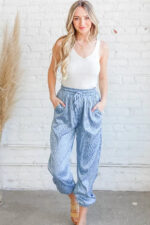 These joggers are made from a luxurious satin fabric with a fierce leopard print pattern, combining comfort with a touch of glamour. The jogger style offers a relaxed fit with elasticized waist and cuffs for added comfort and flexibility. Pair these joggers with a basic tee or a slouchy sweater…