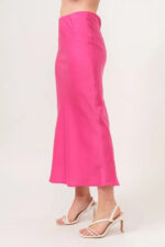 The solid satin midi skirt is a versatile and elegant choice for a sleek and sophisticated look. The satin fabric offers a luxurious and silky feel, perfect for adding a touch of glamour to any outfit. The midi length provides a classic and timeless silhouette that can be dressed up or down for various occasions. This skirt is a chic and versatile piece that can be paired with a blouse for a formal event or with a casual top for a more relaxed ensemble. Ideal for adding a touch of refinement to your wardrobe, the solid satin midi skirt is a stylish and graceful option.