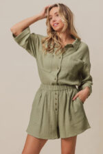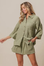 The Crinkle Gauze Shirt and Short Set is a fashionable and comfortable ensemble featuring a shirt and matching shorts made from lightweight crinkle gauze fabric. This coordinating set offers a breezy and casual style perfect for warm weather days or relaxed outings. The crinkle texture adds a laid-back vibe to the outfit while keeping you cool and stylish.