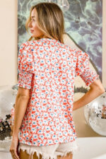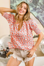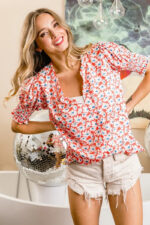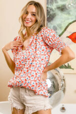 This top showcases a beautiful floral jacquard pattern with smocked detailing that adds texture and visual interest. The puff sleeves and V-neckline create a feminine and stylish silhouette. Perfect for any occasion, this top combines chic style with comfort, making it a versatile addition to your wardrobe.