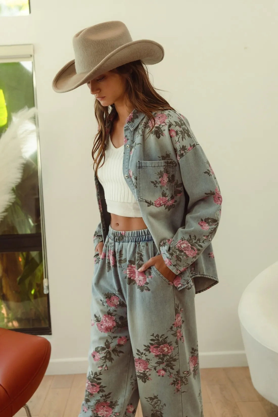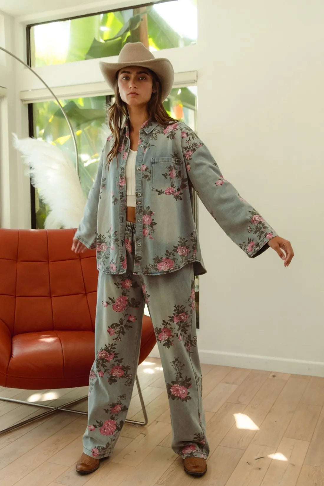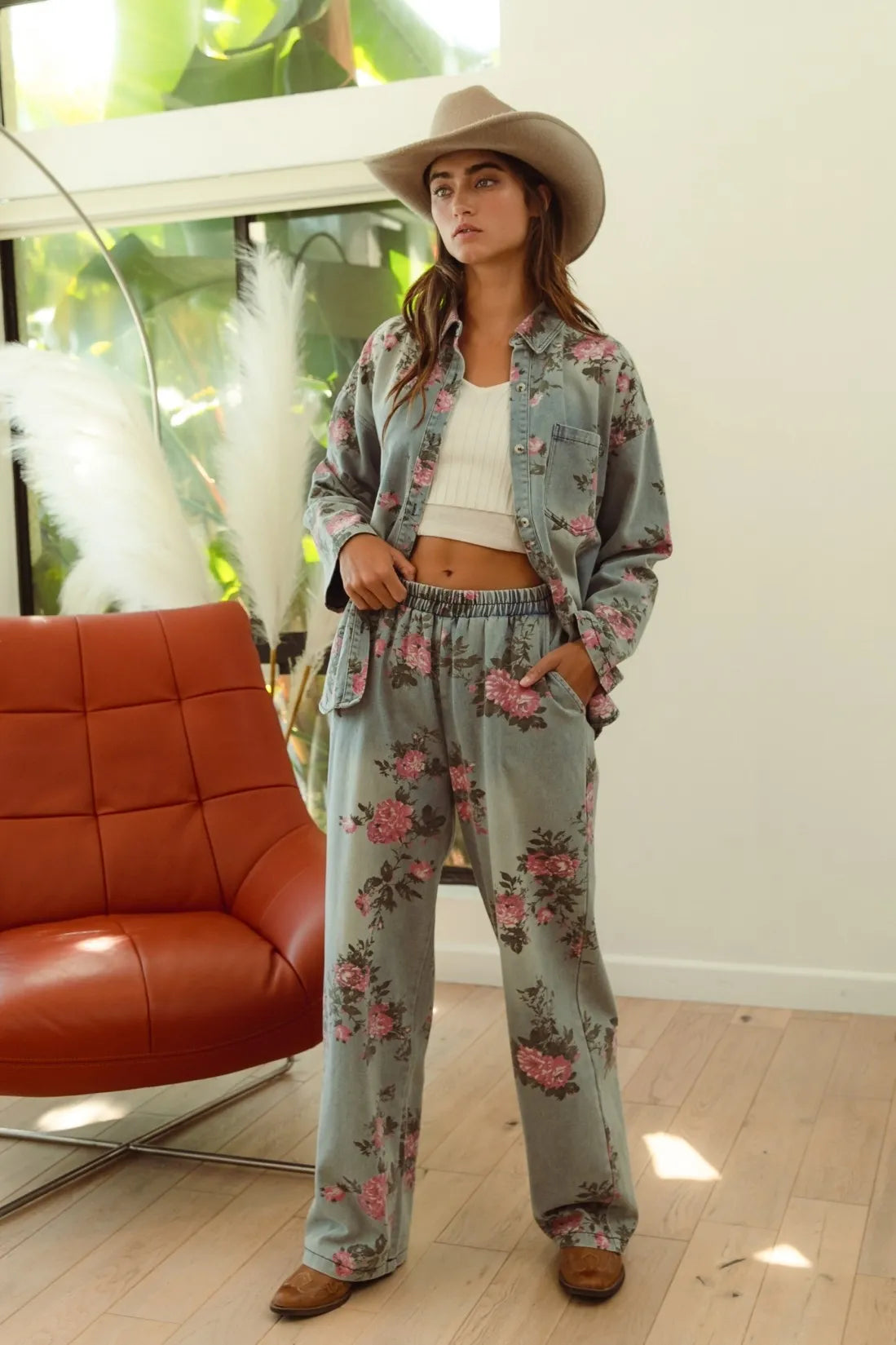 The flower printed denim pants are a vibrant and eye-catching addition to your wardrobe. With a colorful floral pattern scattered across the denim fabric, they exude a whimsical and playful charm. These pants offer a fun twist on classic denim and are perfect for making a statement with your outfit. Pair them with a solid top or a simple blouse to let the floral print take center stage, creating a fresh and stylish look that’s perfect for any casual occasion.