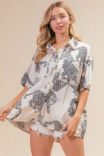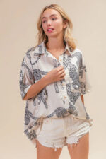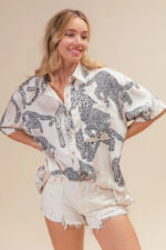 This silky satin shirt top features a bold and stylish leopard print design for a chic and trendy look. The short sleeves add a casual and breezy feel to the top. Perfect for adding a touch of sophistication and glamour to your outfit, this top can be dressed up with tailored pants or dressed down with jeans for a versatile and fashion-forward ensemble.