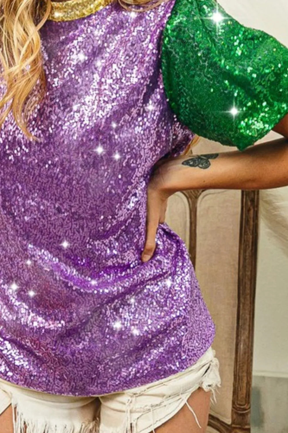 The Mardi Gras Sequin Top is a glamorous and festive choice for celebrating in style. Featuring shimmering sequins, this top is sure to catch the eye and create a dazzling look. Perfect for Mardi Gras festivities or other special occasions, this top will help you stand out in the crowd. Pair it with your favorite bottoms for a fun and spirited ensemble. Get ready to sparkle and shine with this fabulous Mardi Gras Sequin Top!