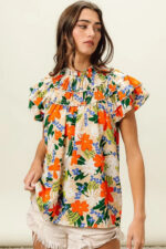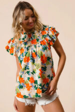 This woven top showcases a vibrant multi-color floral print, adding a cheerful and stylish touch to your outfit. The floral pattern brings a pop of color and a whimsical flair to the design. Perfect for adding a feminine and summery vibe to your look, this top can be paired with jeans, shorts, or skirts for a fresh and fashionable ensemble.