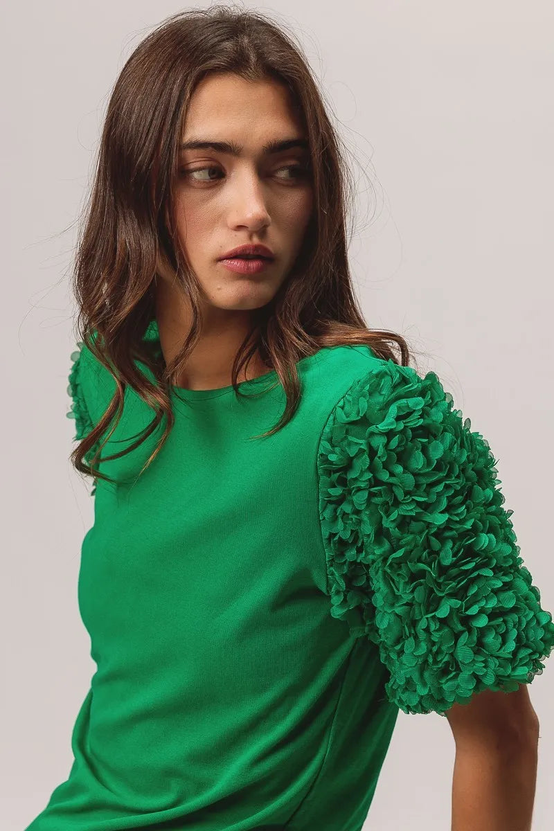 This knit top features short mesh flower sleeves, adding a feminine and elegant touch to the design. The mesh flower detailing creates a stylish and eye-catching look. Made with comfortable knit fabric, this top is perfect for a chic and versatile outfit. Elevate your wardrobe with this trendy short mesh flower sleeve knit top!