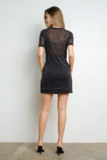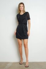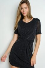 A twisted front glitter mini dress is a fun and glamorous option for a night out or a special event. This type of dress usually features a fitted silhouette with a twist or knot detail at the front, creating a stylish and flattering look. The glitter detailing adds a touch of sparkle and shimmer, making it perfect for parties or celebrations. The mini length adds a flirty and youthful vibe to the dress. You can pair it with heels and statement jewelry for a show-stopping ensemble.