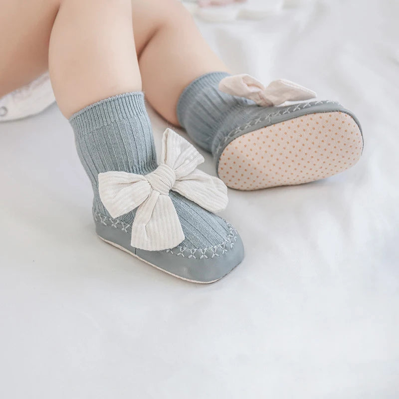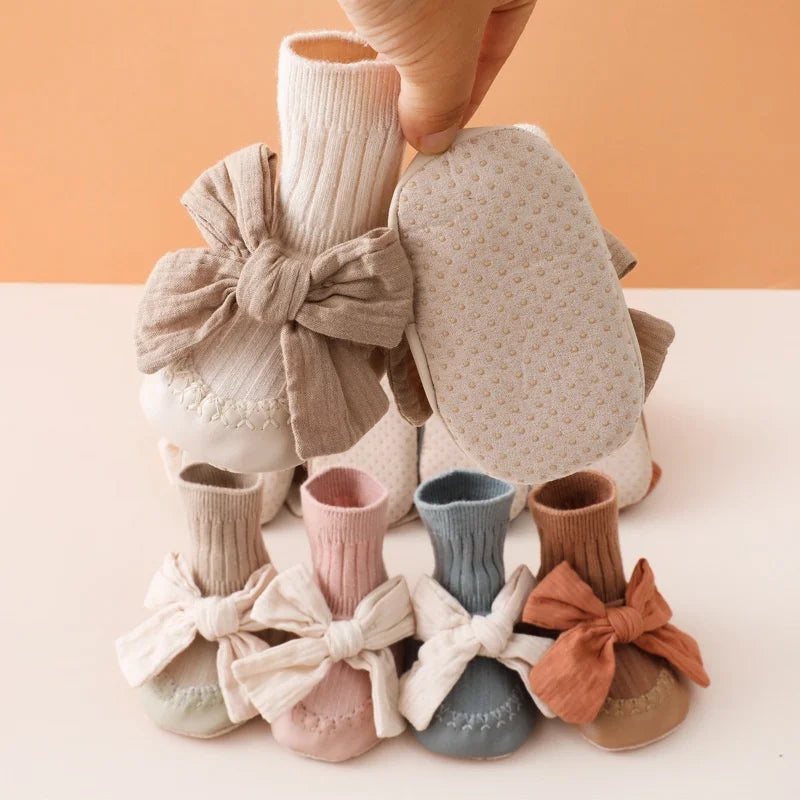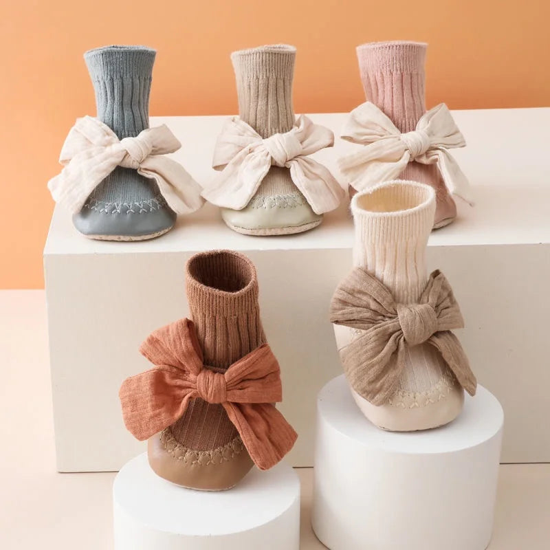 Keep your little princess stylish and comfortable with our Big Bow Baby Socks Shoes. These mid-tube, soft-soled sneakers are perfect for toddlers, offering a snug fit and excellent flexibility. Made from high-quality cotton, they feature a charming big bow and come in solid colors, making them an ideal choice for newborns taking their first steps. Perfect for indoor wear, these floor sneakers provide the support and non-slip safety your baby needs as they explore their world.