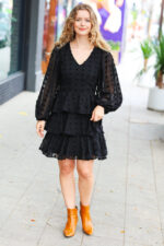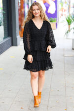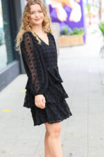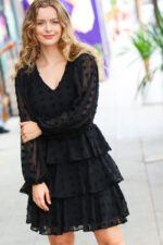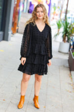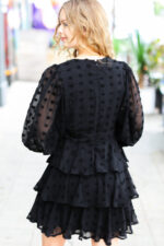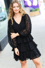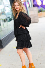 Step into elegance with our exquisite Black Chiffon Swiss Dot V Neck Tiered Ruffle Dress!