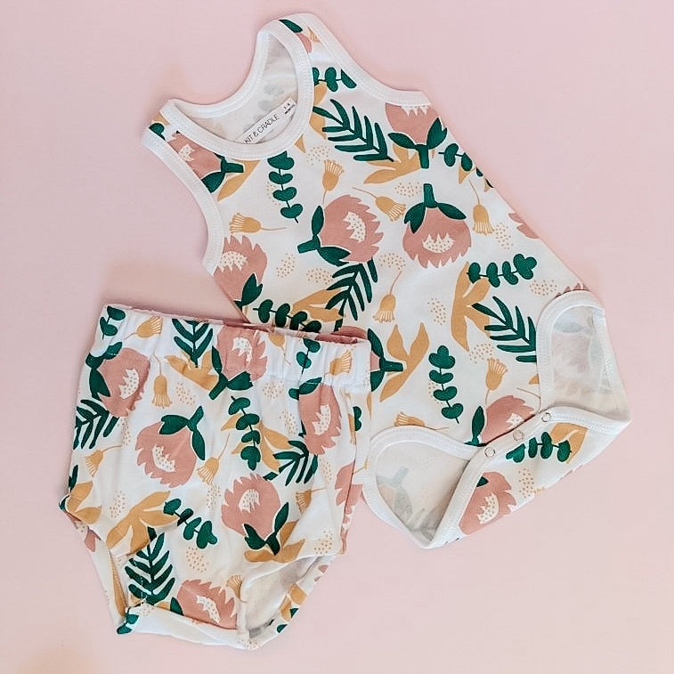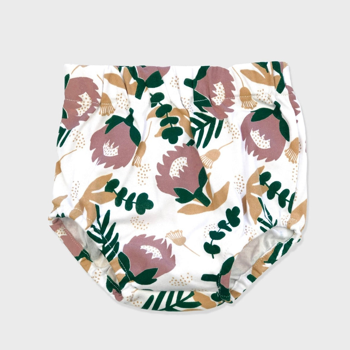 Hello Protea! Another design we have lovingly hand-drawn featuring golden flowering gums, forest green foliage, and striking dusty pink proteas! These bloomers are designed with a higher waist and rounder bottom for complete nappy coverage. They also feature a comfy elastic waistband and legs.  Super stylish and fun! Proudly Designed and…