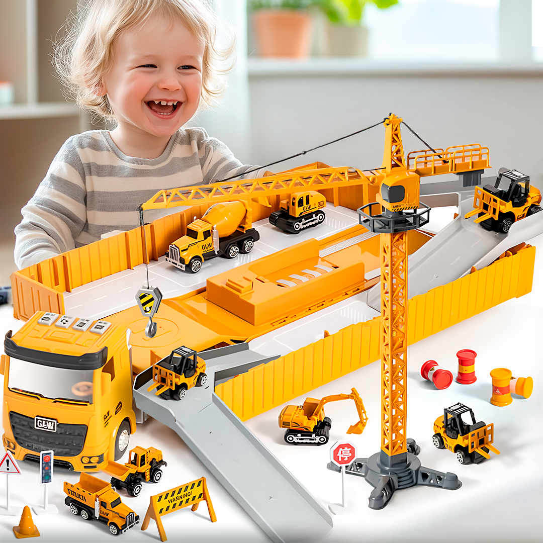 Packed with exciting features, this construction truck set is friction-powered, requiring no batteries. Simply pull back and watch the vehicles zoom into action. The easy-to-assemble track system provides an interactive experience that stimulates hand-eye coordination and imaginative play. Whether it’s a birthday, holiday, or special occasion, this set makes the perfect gift for boys and girls alike.
