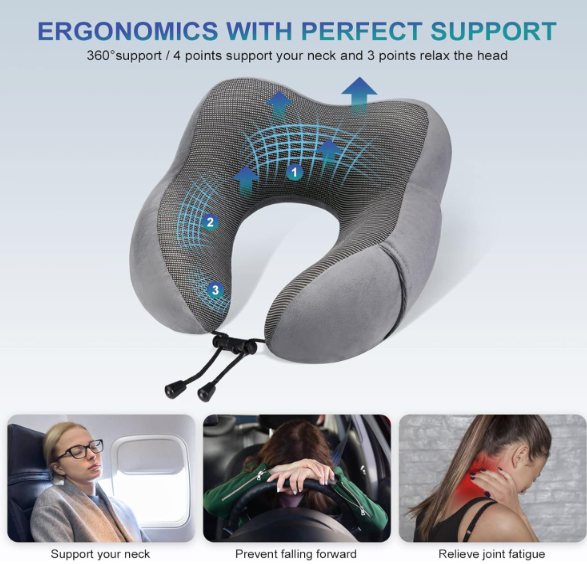- Ergonomic Shape: The neck pillow is designed with orthopedic raised lobe contouring on either side that allow your neck and head to lean comfortably against the soft yet supportive memory foam cushion. Ideal for sleeping in your seat during long plane flights/car travel or sitting upright in any type of chair.