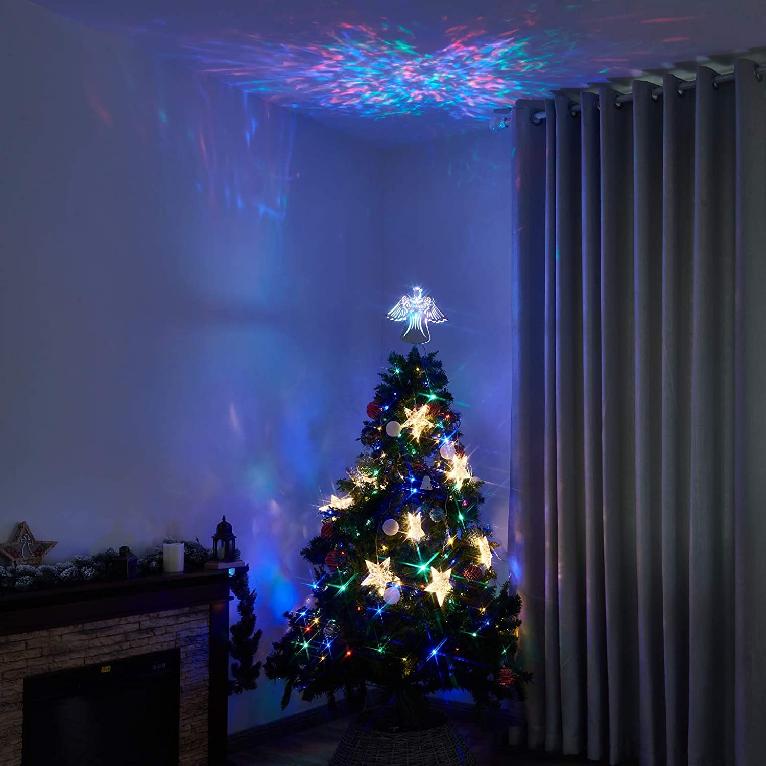 This angel s anything but serene. The rainbow colors that this Angel Rainbow Light Projector Tree Topper throws onto the ceiling above it are truly heavenly to look at. The multi-colored water ripple effect draws eyes as does the glittery angel who projects them. You will be so mesmerized by looking up at the lighting you may even forget to look at your actual tree!