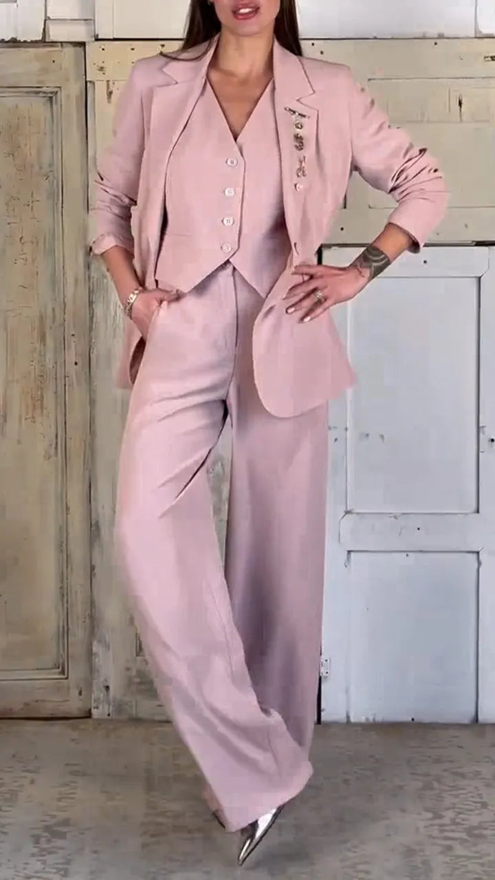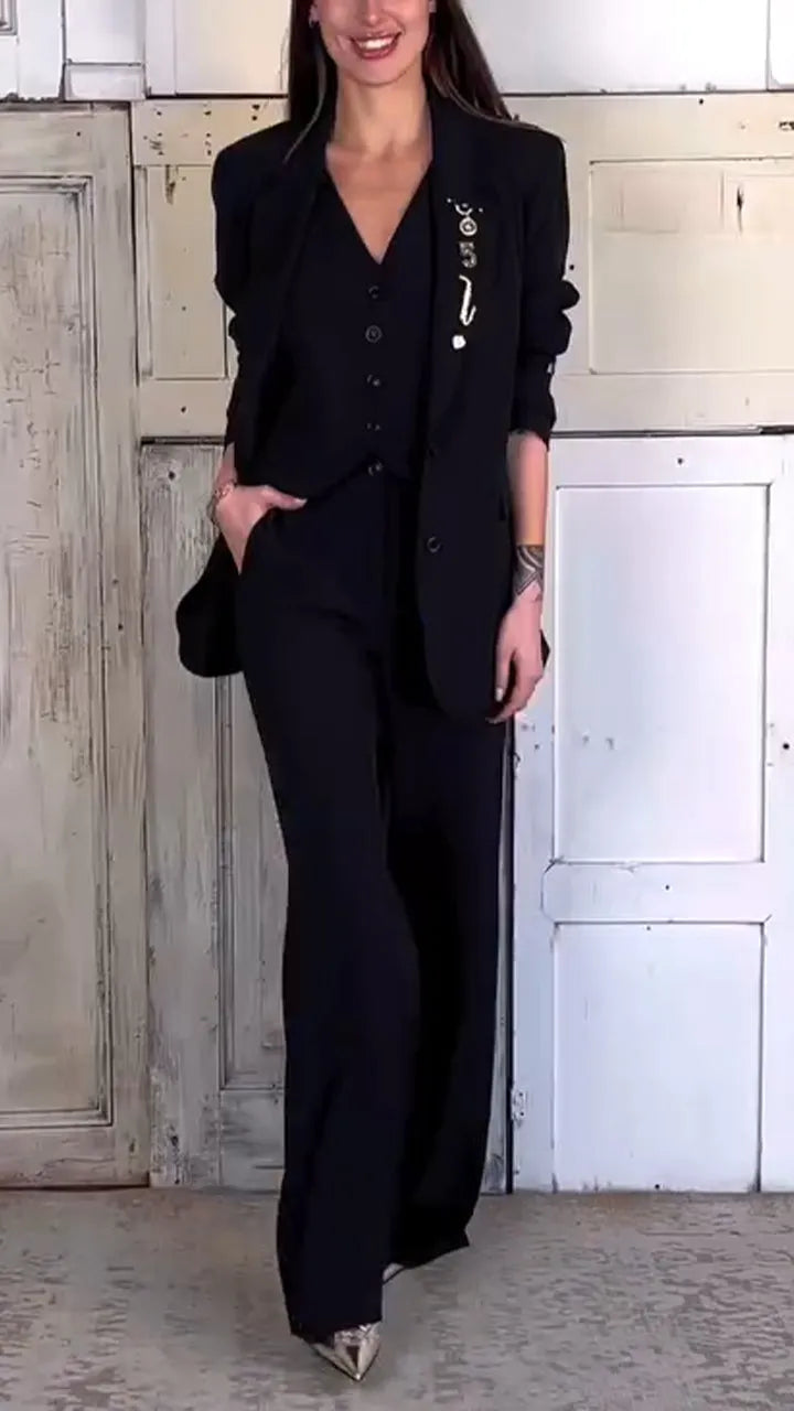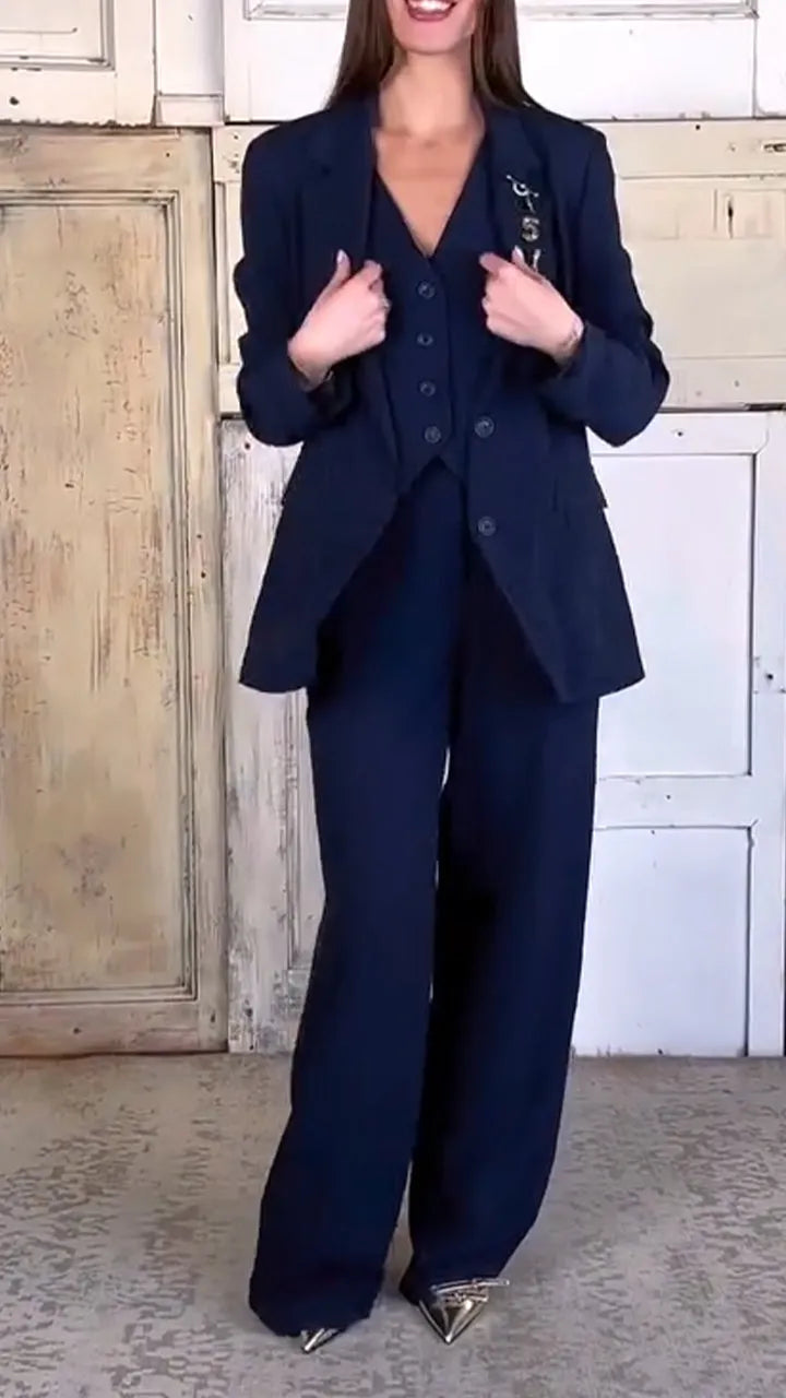Step into elegance with Circe™, the three-piece suit featuring loose-fitting trousers, a lapel blazer, and a buttoned vest top. Made from lightweight, breathable fabric, this suit offers a stylish yet comfortable fit, making it the perfect choice for business meetings, formal events, or chic daywear.