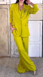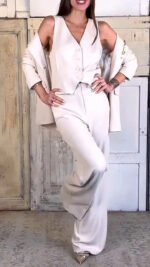 The lapel blazer adds a classic, refined touch, while the loose trousers offer a relaxed fit that’s both flattering and comfortable. The buttoned vest top completes the set with a tailored look, perfect for creating a sophisticated silhouette with ease.