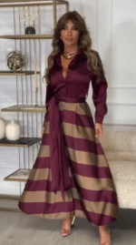 The Clarisa™ dress is the epitome of elegance and luxury, designed for the woman who wants to make a statement. Featuring a long-sleeve shirt-style top and a flowing striped skirt, this dress is perfect for any formal event or special occasion. The satin-like fabric gives it a sophisticated and rich feel, while the belted waist adds a touch of structure, making you look effortlessly chic.