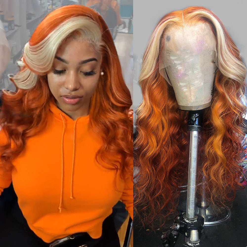 Cranberry Transparent Ginger Wig With Blonde Highlights Colored Lace Front Wigs Body Wave Ombre Human Hair Wigs