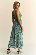 The multi-smocked bodice, geo ruffle strappy midi dress is a stylish and feminine piece perfect for various occasions. The smocked bodice offers a form-fitting and flattering silhouette, while the geo ruffle detailing adds a playful and trendy element to the dress. The midi length is elegant and versatile, making it suitable for both casual and dressier events. The strappy design adds a touch of sophistication and a summery vibe to the dress. This dress can be styled with sandals or heels for a chic and on-trend look. Overall, the multi-smocked bodice, geo ruffle strappy midi dress is a fashionable option that allows you to make a statement with your outfit.