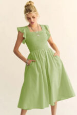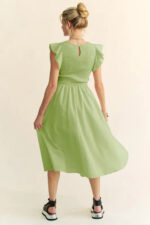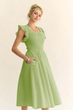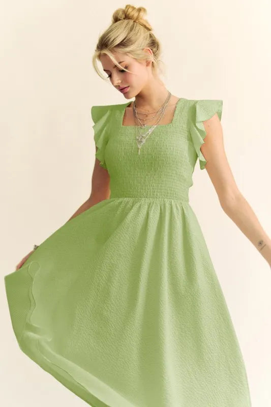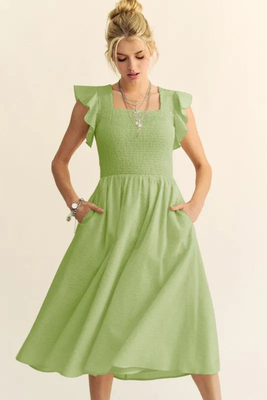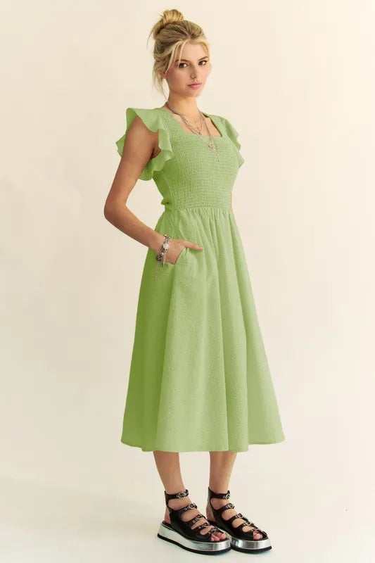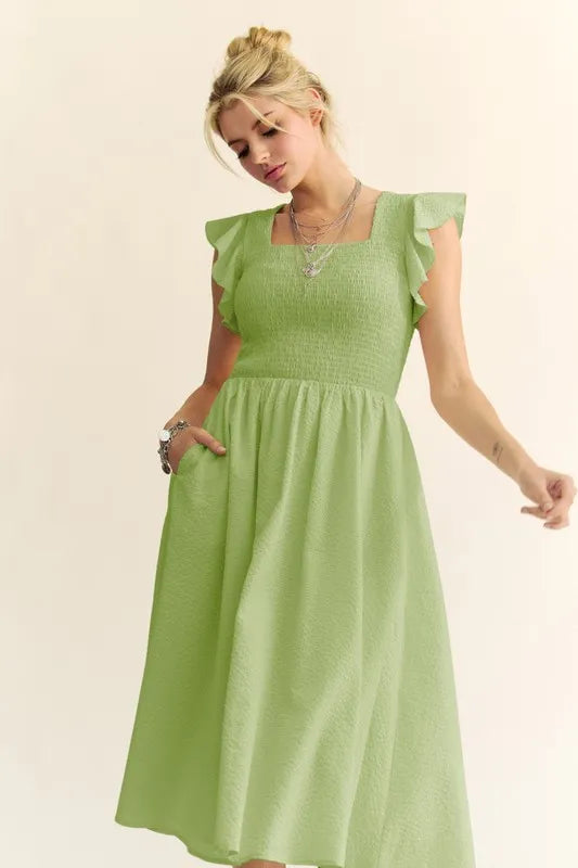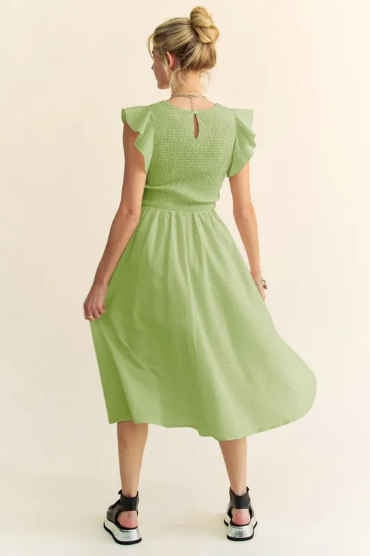 The Textured Ruffle Cap Sleeve Smocked Midi Dress is a charming and feminine option for a variety of occasions. The textured fabric adds visual interest and depth to the dress. The ruffle cap sleeves bring a playful and romantic touch to the design. The smocked waistline creates a flattering silhouette that accentuates the figure. This midi dress is versatile and can be styled up or down with the right accessories for a chic and elegant look.