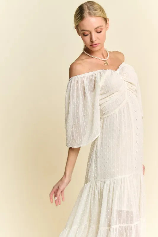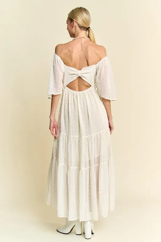 Swiss Dotted Ruched Ruffle Open Back Midi Dress