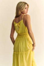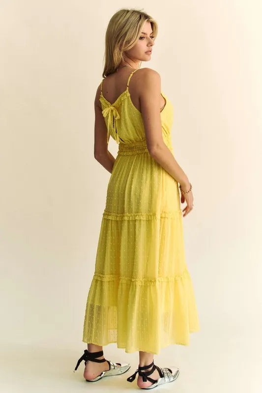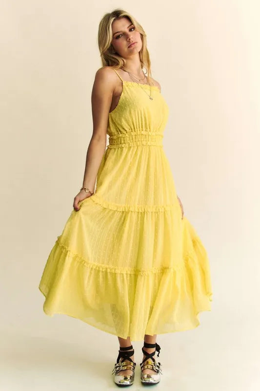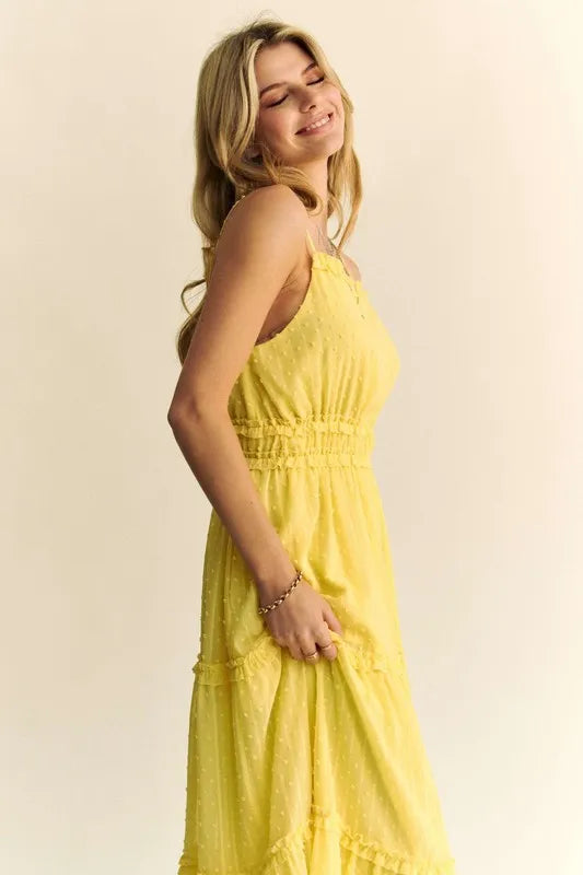 A texture Swiss dot ruffle square neck midi dress is a charming and feminine garment featuring Swiss dot fabric with a textured appearance, ruffle detailing, a square neckline, and a midi length. The Swiss dot fabric adds a delicate and whimsical touch to the dress, while the ruffle accents enhance its romantic appeal. The square neckline provides a sophisticated and flattering look, and the midi length offers a versatile option suitable for various occasions, from casual gatherings to semi-formal events.