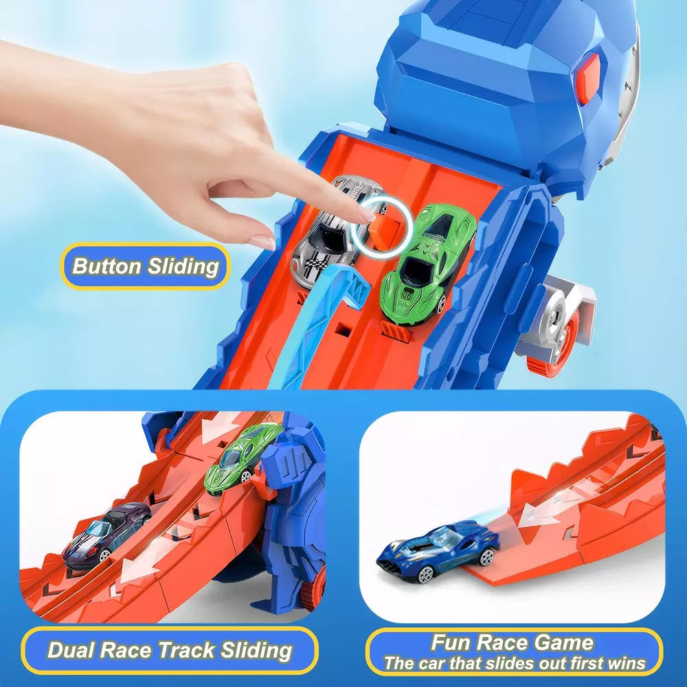 Simply push or pull the dinosaur truck to transport your mini cars around the play area. When ready for a race, fold out the sliding track to create a dual-lane raceway. Place your cars on the track and watch them speed side-by-side for an exciting racing experience. To switch back to storage mode, collapse the track and use the truck as a parking space for easy organization. For imaginative play, stand the dinosaur upright to transform it into a fierce Tyrannosaurus Rex, bringing your child’s adventures to life.