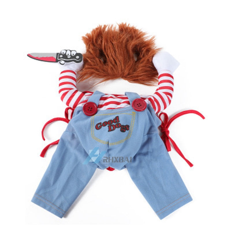 with this Halloween Costume for your Pup! This half coat and hood is a comfy fit for your pup and has the decorations of a delightful toy doll… except for that slightly suspicious knife he’s wielding. We’re pretty sure that’s just to help you cut up the bacon bits, though!