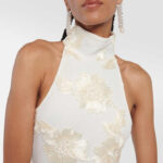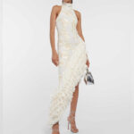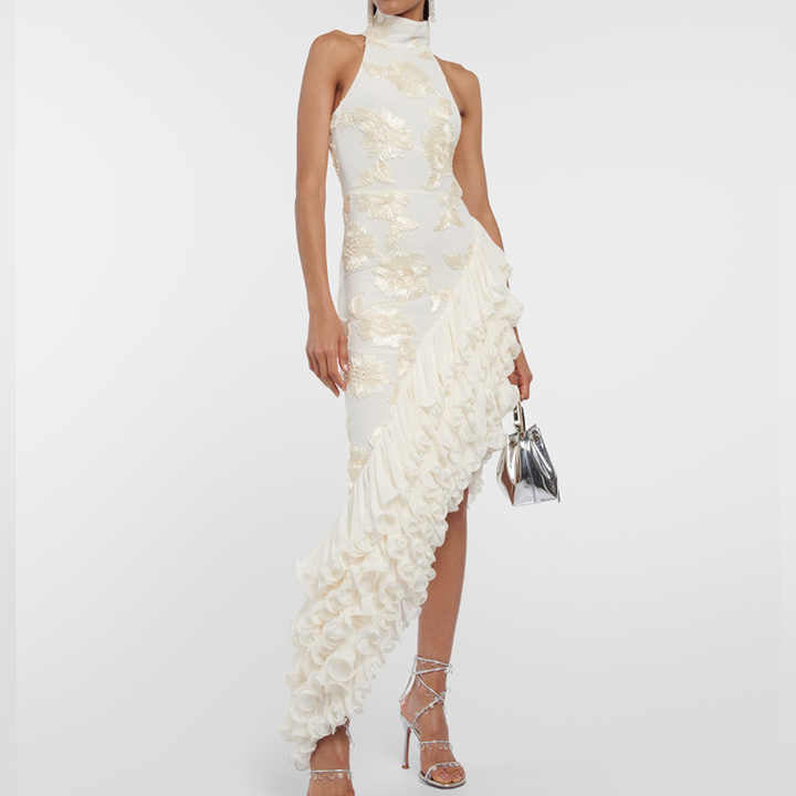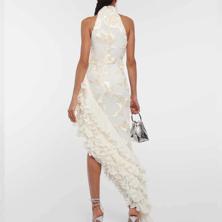 Crafted from luxurious fabric, the Hebe™ dress offers a flattering fit while providing comfort and style. The high-neck design gives it a sleek, refined look, while the ruffled bottom adds texture and movement. The floral accents around the dress enhance its feminine appeal, making it the ideal choice for gala events, weddings, or any occasion that calls for something truly special.