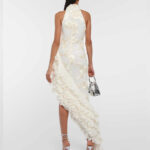 The Hebe™ dress is a stunning blend of elegance and bold fashion. Featuring a high-neck design and sleeveless cut, this dress exudes chic sophistication. The ruffled hemline with its diagonal flow creates a unique, fashion-forward silhouette that’s perfect for any special occasion. The delicate floral details surrounding the dress add a feminine touch, making Hebe™ the perfect standout piece for your wardrobe.