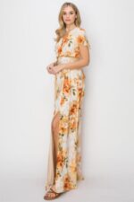 Experience unmatched elegance with our floral tie back short sleeve slit maxi dress, designed for any occasion.