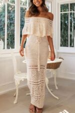 Description Indulge in effortless elegance with our Knit Crochet Texture Cutout Lace-Up Maxi Dress With Shawl . Perfect for any occasion, this dress exudes sophistication and style.  Two-Piece Set: Dress+Shawl Length: Ankle-Length Material: Polyester Sleeve Type: Cape Sleeve Neckline: Off Shoulder Style: Vacation Wear Fit Style: Loose Fit @Note:Size: please…