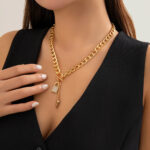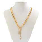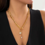 This elegant lock and key necklace combines classic style with modern sparkle through its gleaming gold chain and crystal details.