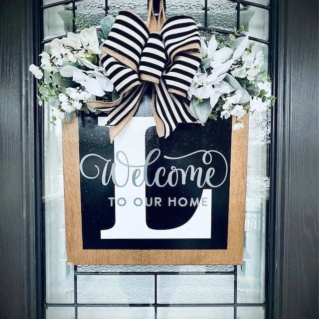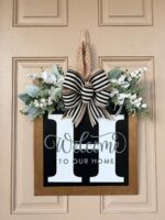 - Includes: Striped bow, Greenory, Welcome Front Door Sign