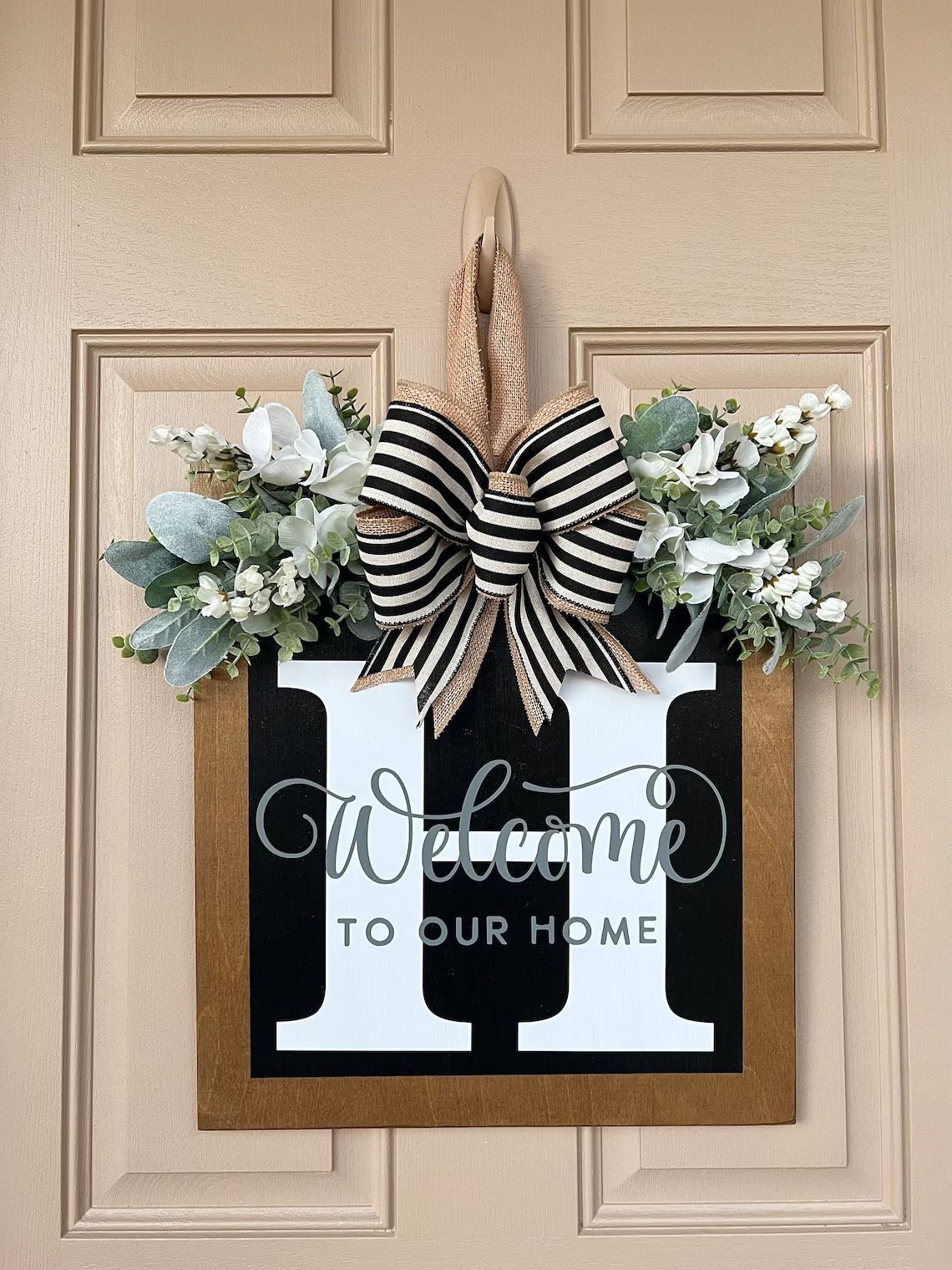 This monogram sign is a beautiful addition to any front door, mantle, wall, entryway. This door hanger makes the perfect gift and is perfect anywhere in the home anytime of the year.