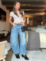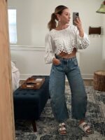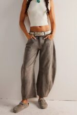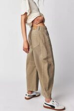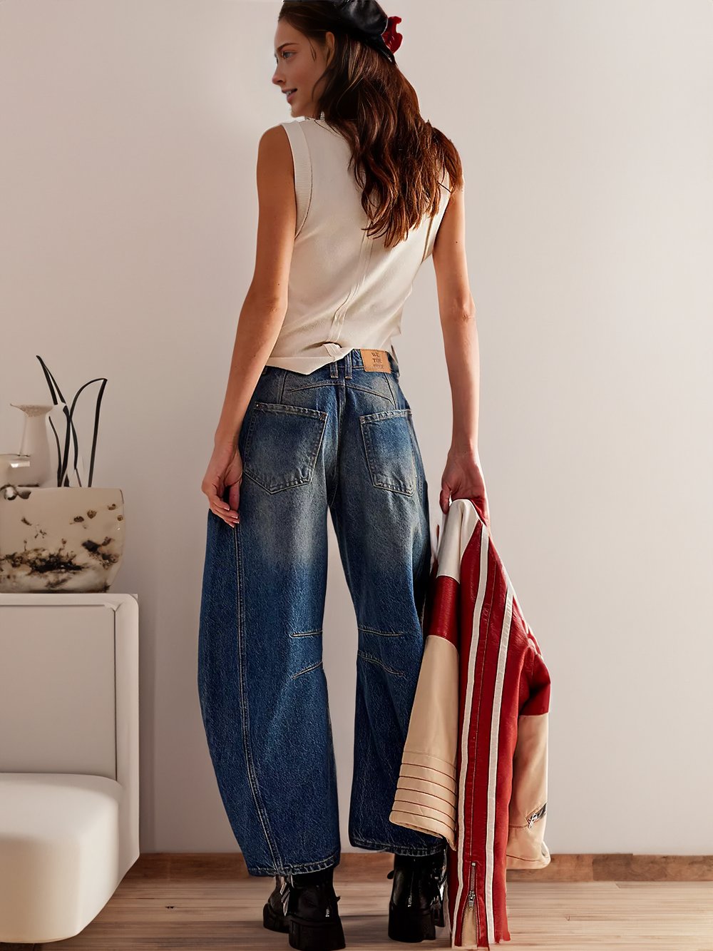 The Horseshoe feels a bit sculptural, but still has the ability to look relaxed and sophisticated. It references vintage styles, yet feels modern. Aptly named Horseshoe Jeans, this pair is fashioned with curved, wide legs that fall slightly tapered and have cropped, frayed hems. The strategic darts at the knees and calfs here are key to creating that cool barrel shape.