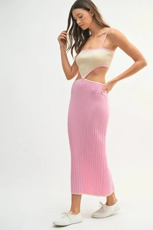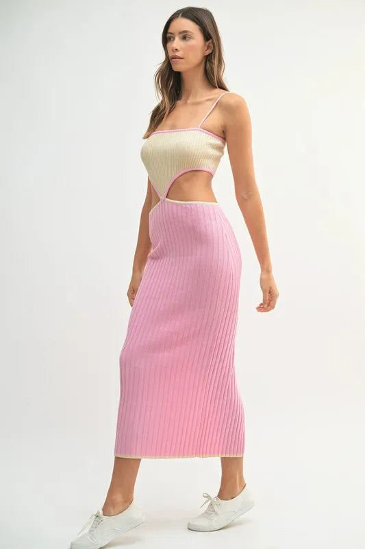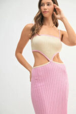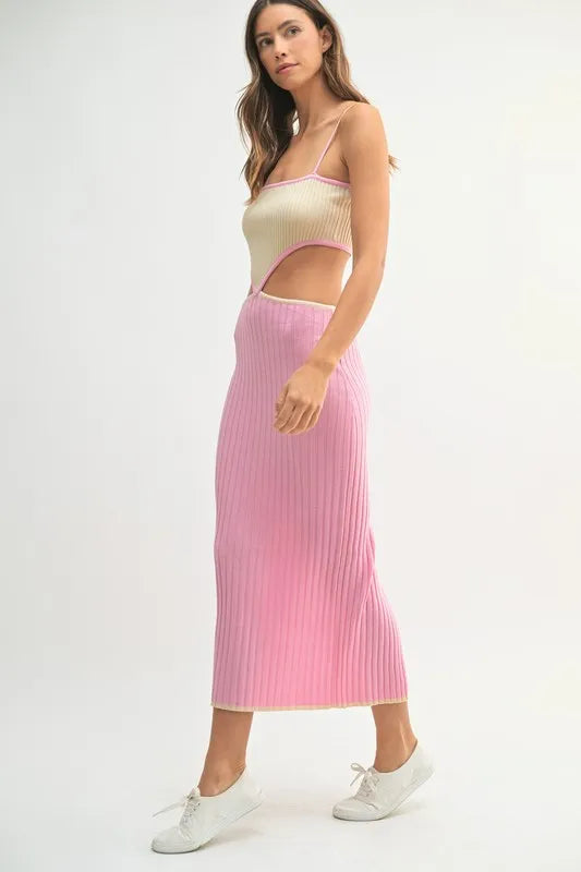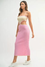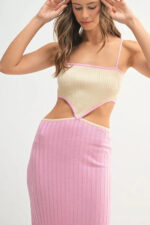 The ribbed knit color block cutout midi dress showcases a modern and edgy style with its color block design and cutout details. The ribbed knit fabric adds texture and dimension to the dress, creating a sleek and form-fitting silhouette. Perfect for a night out or a special event, this midi dress offers a bold and fashionable look that is sure to turn heads and make a statement.