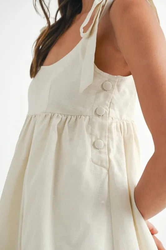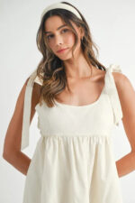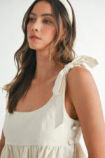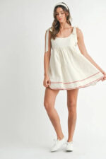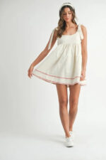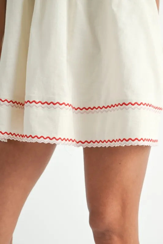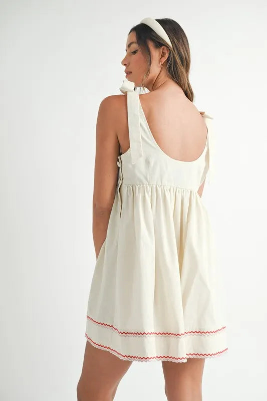 This Zig Zag Embroidery Shoulder Tie Mini Dress features intricate zig-zag embroidery detailing on the shoulders and a stylish tie design. The mini dress is both chic and playful, perfect for a fun and fashionable look. The unique shoulder embellishments and tie accents add a trendy touch to the outfit, making it a standout piece for any occasion.
