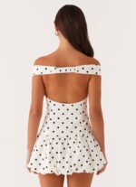 Turn heads with Madelyn™, the stunning off-shoulder mini dress that blends timeless elegance with playful charm. Featuring a classic black polka dot print, this dress adds a touch of vintage sophistication, while its flirty silhouette and exposed shoulders create a look that is both romantic and effortlessly chic.