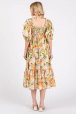 The Flower Print Puff Sleeve Ruffle Smocked Midi Dress features a beautiful floral pattern and trendy puff sleeves. The dress also includes ruffle detailing and a smocked bodice for a flattering fit. It is the perfect choice for a stylish and feminine look.