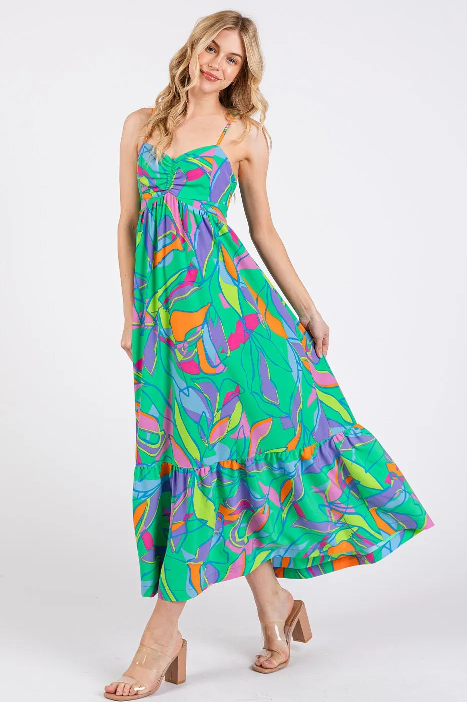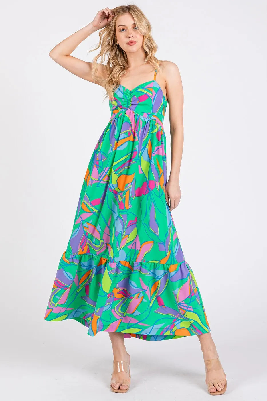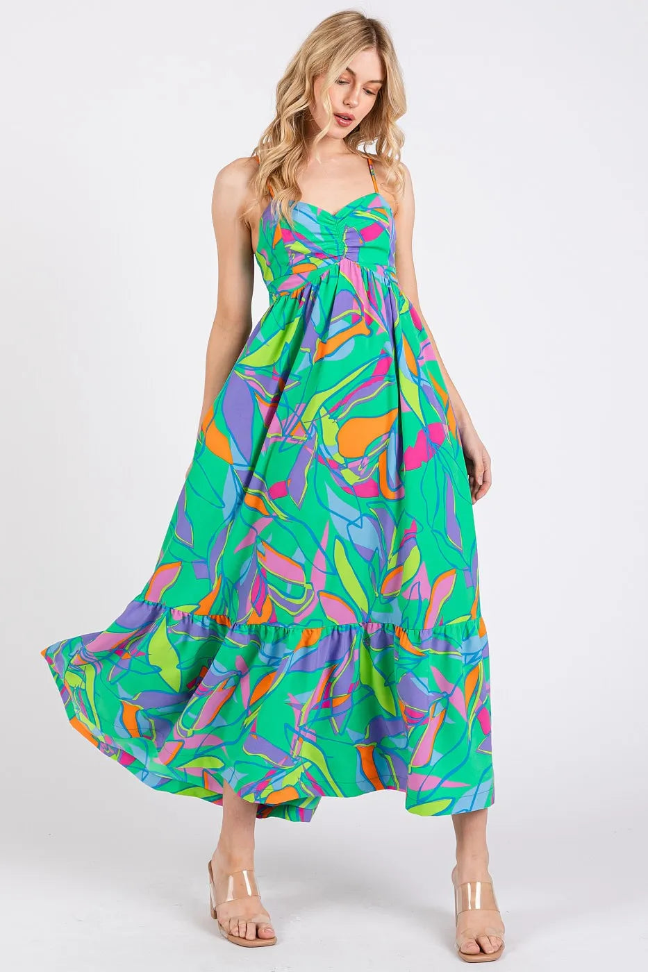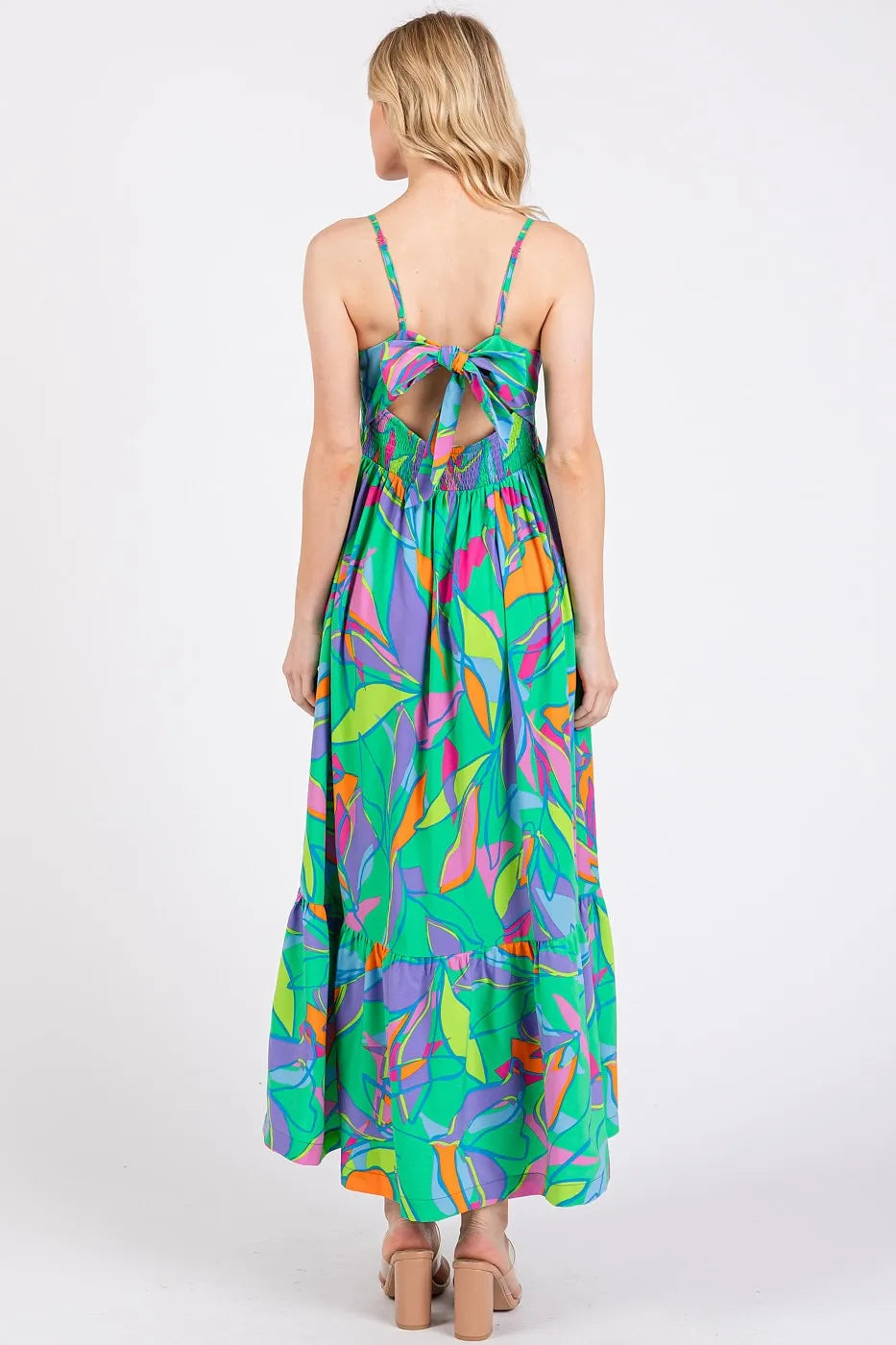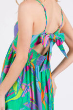 This maxi dress features a vibrant multicolor leaf print and a tie back design for a stylish and summery look. The leaf print adds a tropical and playful touch to the dress. With a flattering maxi length and tie back detail, this dress is perfect for a chic and breezy outfit. Elevate your wardrobe with this trendy multicolor leaf print tie back maxi dress!
