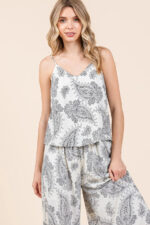 The Paisley Print Cami and Pants Set is a trendy and stylish outfit option. Featuring a paisley print design, this set offers a bohemian and chic look. The cami top adds a touch of femininity, while the matching pants create a coordinated ensemble. Wear this set with sandals for a laid-back and fashionable outfit perfect for a day out or a casual event.