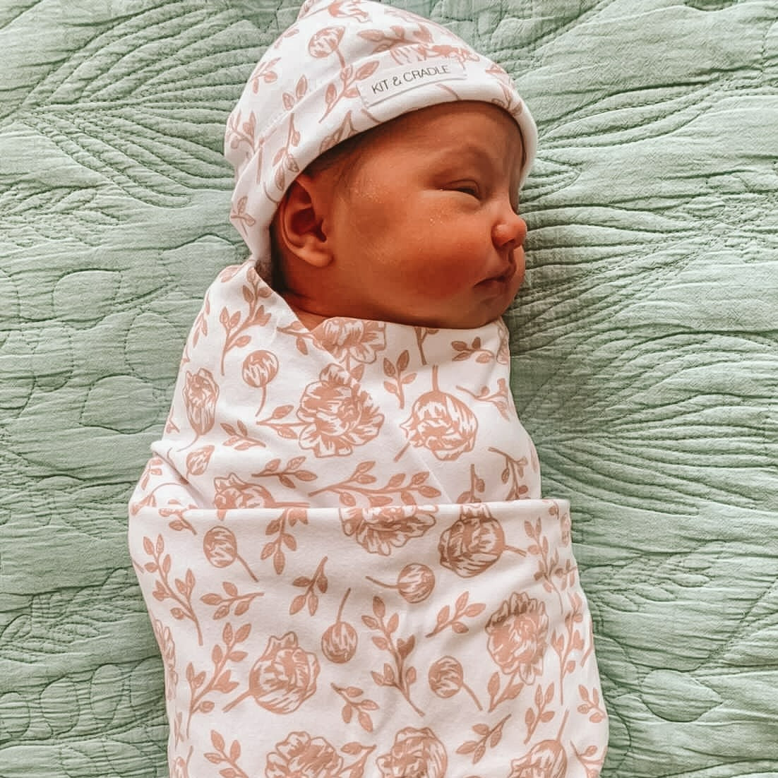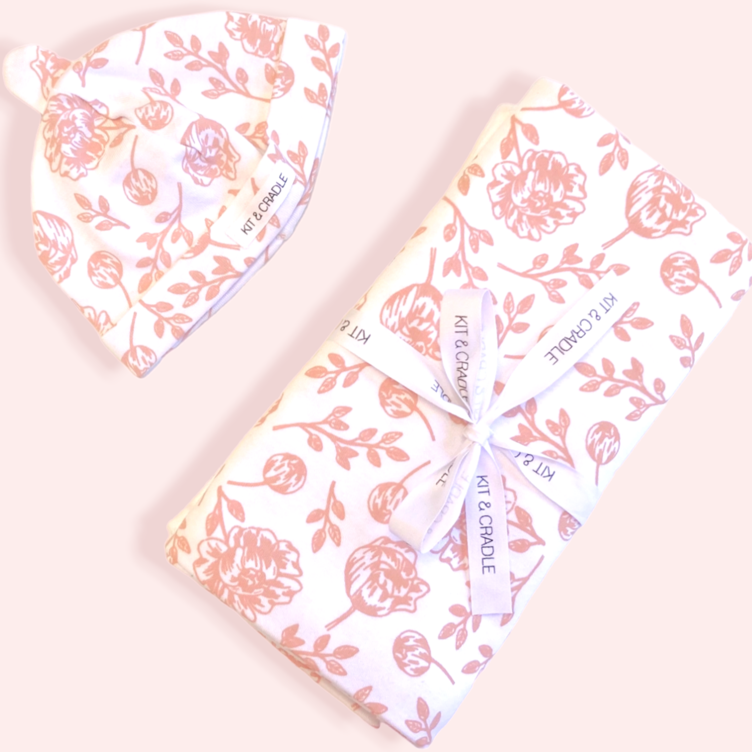 Looking for the perfect baby shower or new arrival gift? Save with our matching bundle sets. A flower close to our heart is the breathtaking peony, simple and perfect in our beautiful blush pink pattern. Each set contains: Organic Cotton Blanket, Newborn Beanie or Knot Headband. Proudly Designed, Printed and…