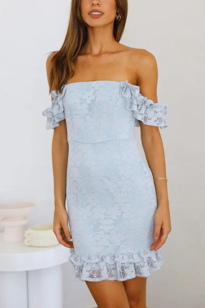 Capture elegance and charm with this enchanting ruffle lace off-the-shoulder bodycon dress.